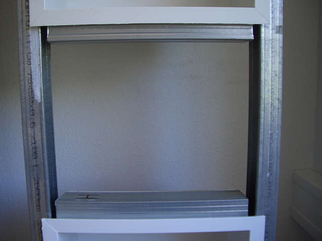 Mit Hilfe von runden Stahlankern werden die montierten Kästen im Anschluss einfach in die CW-Profile des aufgebauten Metallständerwerks eingesetzt und arretiert. Die Flächen zwischen und um die Kästen herum braucht man nur noch mit zugeschnittenen Gipskartonplatten beplanken und nach seinen Vorstellungen tapezieren, streichen oder verputzen.